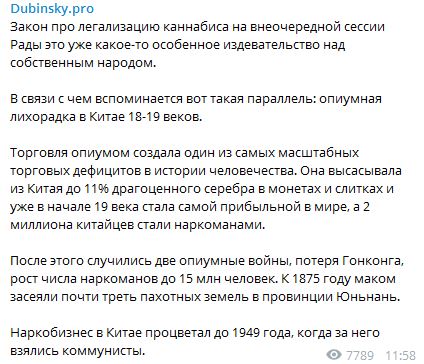 "Закон про легализацию каннабиса на внеочередной сессии Рады - это уже какое-то особенное издевательство над собственным народом. В связи с чем вспоминается вот такая параллель: опиумная лихорадка в Китае 18-19 веков.