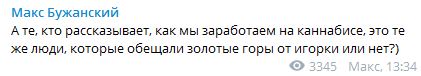 Что касается планов о "миллиардах долларов инвестиций" Максим Бужанский написал: "А те, кто рассказывает, как мы заработаем на каннабисе, это те же люди, которые обещали золотые горы от игорки или нет?"
