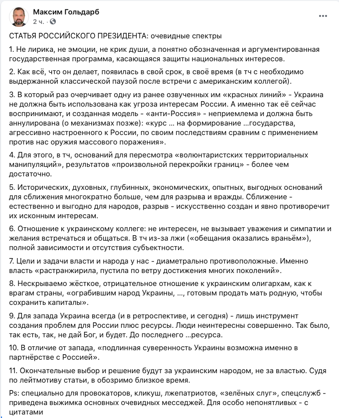 Общественный деятель Максим Гольдарб сделал 11 выводов из публикации президента России.