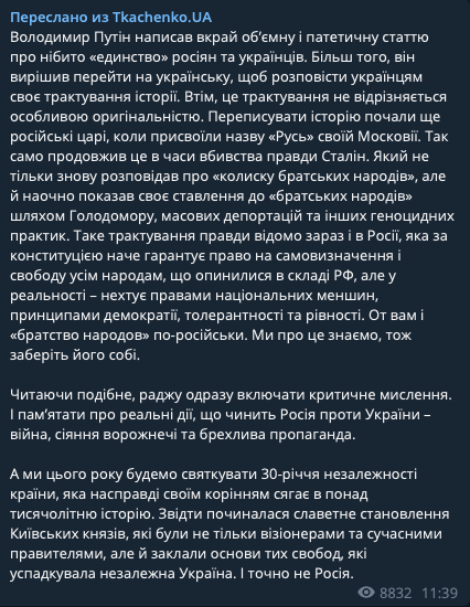 "Владимир Путин написал крайне объемную и патетическую статью о якобы "единстве" россиян и украинцев. Более того, он решил перейти на украинский, чтобы рассказать украинцам, как трактовать свою историю. Впрочем, эта трактовка не отличается особой оригинальностью. Переписывать историю начали еще русские цари, когда присвоили название "Русь" своей Московии. Так же продолжил это во времена убийства правды Сталин. Который не только вновь рассказывал о "колыбели братских народов", но и наглядно показал свое отношение к "братским народам" путем Голодомора, массовых депортаций и других геноцидных практик. Такая трактовка правды известна сейчас и в России, по конституции гарантирует право на самоопределение и свободу всем народам, оказавшимся в составе РФ, но в реальности - пренебрегает правами национальных меньшинств, принципами демократии, толерантности и равенства. Вот вам и "братство народов" по-русски. Мы об этом знаем, поэтому заберите его себе.