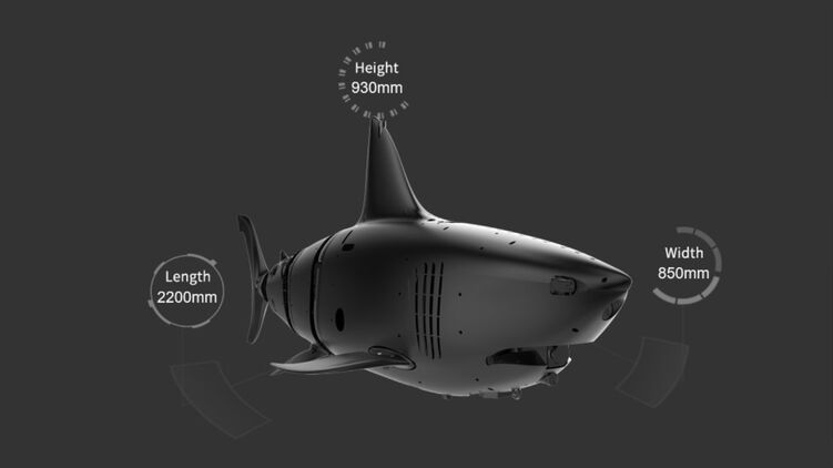 По обнародованным в материале данным, общая длина акулы-дрона составляет 2,2 метра, его максимальная скорость под водой 18,5 км в час. Аппарат оборудован системой "всестороннего избегания препятствий".