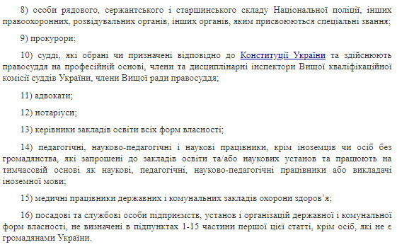 Исчерпывающий список должностей приводится в статье 9 закона о тотальной украинизации. Из них такие категории обязаны будут пройти через экзамен: