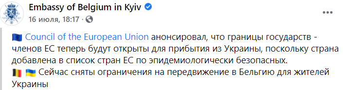 "Сняты ограничения на поездки в Бельгию для жителей Украины", - говорится в Facebook посольства.