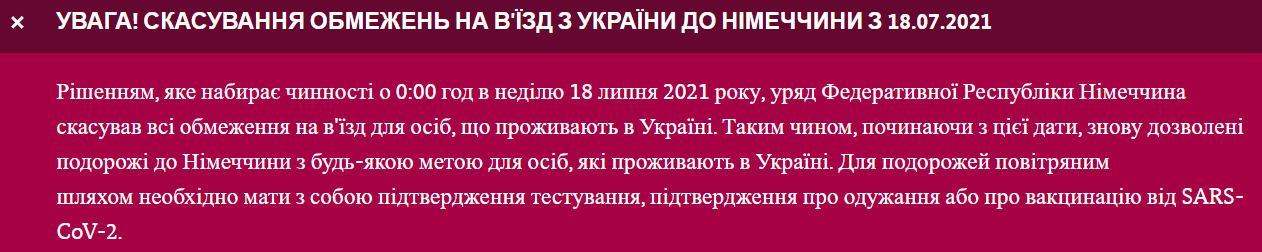 С 18 июля ФРГ открыла въезд для всех граждан Украины. Раньше туда пускали только полностью привитых от коронавируса (прививками, одобренными в ЕС) и тех, кто обосновал исключительные основания для въезда.
