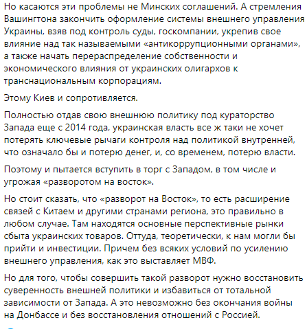 "Во-первых, нет никаких пока свидетельств того, что Россия и Запад вообще близки к какому-то компромиссу и глобальным договоренностям по Украине или, тем более, по Китаю. Также нет никаких даже намеков на то, что Украину Запад в какой-то особо жесткой форме (а не обычными увещеваниями, на которые в Киеве мало обращают внимание) будет склонять к выполнению Минских соглашений.