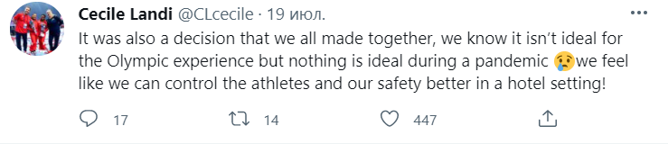 "Это было решение, которое мы все приняли вместе. Мы знаем, что оно не идеально для Олимпийских игр, но нет ничего идеального во время пандемии. Мы чувствуем, что можем лучше контролировать спортсменов и нашу безопасность в условиях отеля", - написала в своем Twitter личный тренер четырехкратной олимпийской чемпионки Симоны Байлз Сесиль Ланди.
