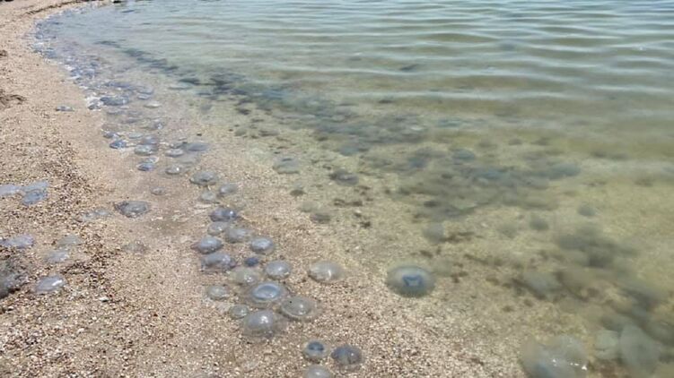 В пляжах Азовского моря в курортной Кирилловке в Запорожская области, где продолжается нашествие медуз, туристы укладывают морских существ в "братские могилы". В одну из таких ям провалилась женщина.