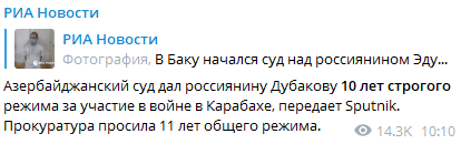 В четверг, 22 июля, в Баку прошло заседание суда по уголовному делу гражданина России Дубакова Эдуарда, воевавшего на стороне Армении в качестве наемника в Нагорном Карабахе. Мужчину осудили на десять лет строгого режима.