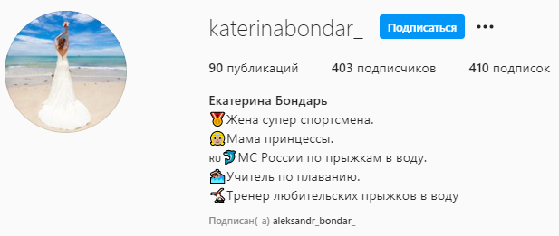 "Жена супер спортсмена, мама принцессы, мс России по прыжкам в воду, учитель по плаванию, тренер любительских прыжков в воду".