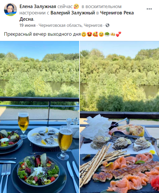 Елена Залужная также часто публикует их совместный с мужем досуг - например, ужин, состоящий из устриц и прочих деликатесов.
