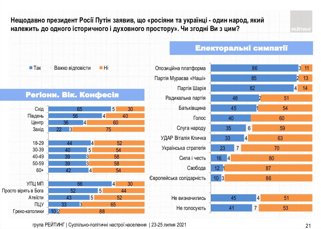 Социологическая компания "Рейтинг" опубликовала опрос, который уже стал сенсацией. Главным образом потому, что украинцев спросили, согласны ли они с тезисом Владимира Путина о том, что русские и украинцы – один народ.
