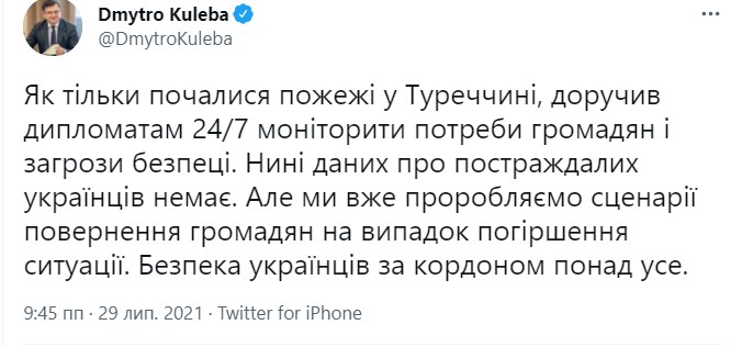 В МИД Украины сообщили, что среди пострадавших в лесных пожарах украинцев нет, но в ведомстве разрабатывают сценарии возвращения граждан Украины домой на случай ухудшения ситуации. Сейчас для украинцев в случае угрозы жизни и здоровью действует горячая линия консульства в Антальи: +90 554 169 96 60 и посольства Украины в Турции +90 539 550 98 98; +90 312 442 15 93.