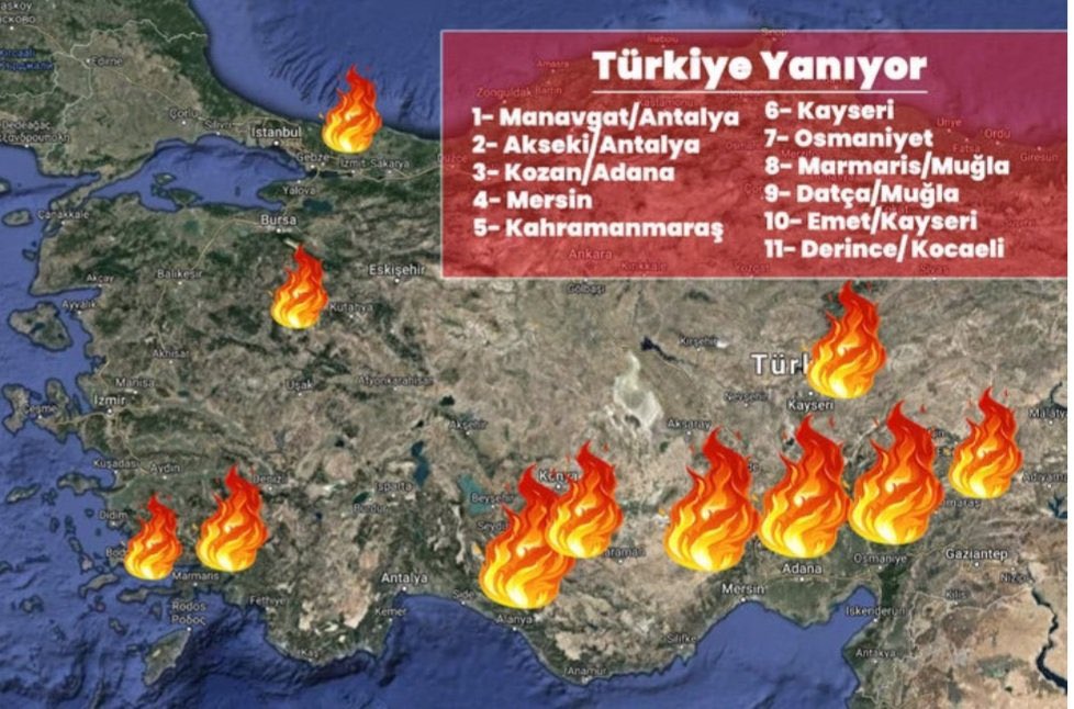 И крупные пожары начались в сотнях километрах от Антальи - вблизи Аланьи и Бодрума, Адана, Мерсина.
