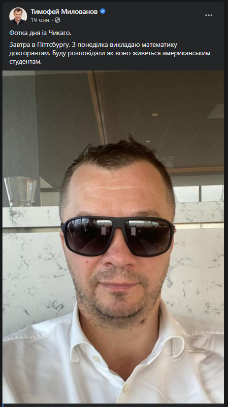 Тимофей Милованов, который, как сообщала "Страна", после драки с бывшим секретарем Совета национальной безопасности и обороны Александром Данилюком, улетел в Америку, опубликовал фото из Чикаго в темных очках.