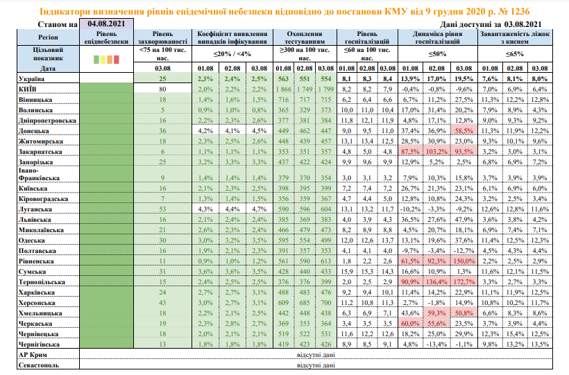 По состоянию на утро среды, 4 августа, в Украине, где число новых зараженных коронавирусом выросло за 24 часа почти на тысячу человек, в пяти областях один из эпидемических показателей не соответствует "зеленой" зоне карантина.
