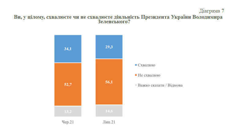 Социологи заметили снижение уровня поддержки деятельности украинского лидера в июне 2021 года. Тогда 34,1% респондентов выразили поддержку действиям Зеленского, а 52,7% не поддержали его. Таким образом за месяц еще около 5% украинцев разочаровались в президенте страны.