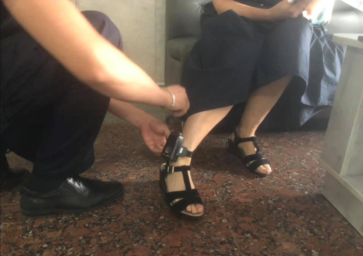 Фото: с подозреваемой Кузьменко снимают электронный браслет. Источник: Петр Киян, Facebook