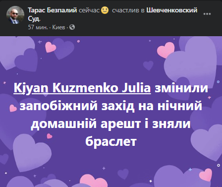 "Юлии Кузьменко изменили меру пресечения на ночной домашний арест и сняли браслет", - написал адвокат