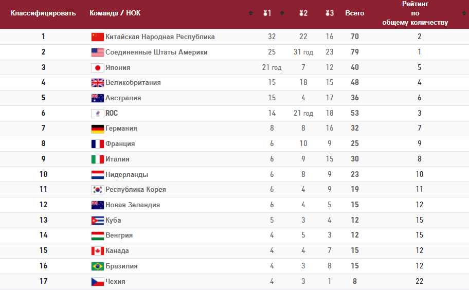 В общем медальном зачете Токио-2020 лидируют Китай, США и Япония.