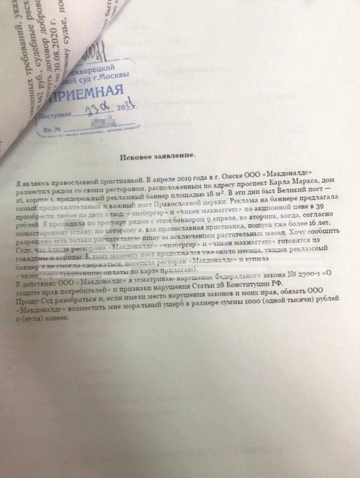 В документе женщина описала обстоятельства искушения, которое произошло в Омске еще в 2019 году. Тогда ресторан разместил возле одного из своих заведений большой рекламный баннер, на котором предлагалось полакомиться чизбургером или чикен-макнаггетсом, продававшимся по акционной цене (39 рублей, или 14 гривен). А в то время как раз был Великий пост - самый важный и длительный в православной церкви.