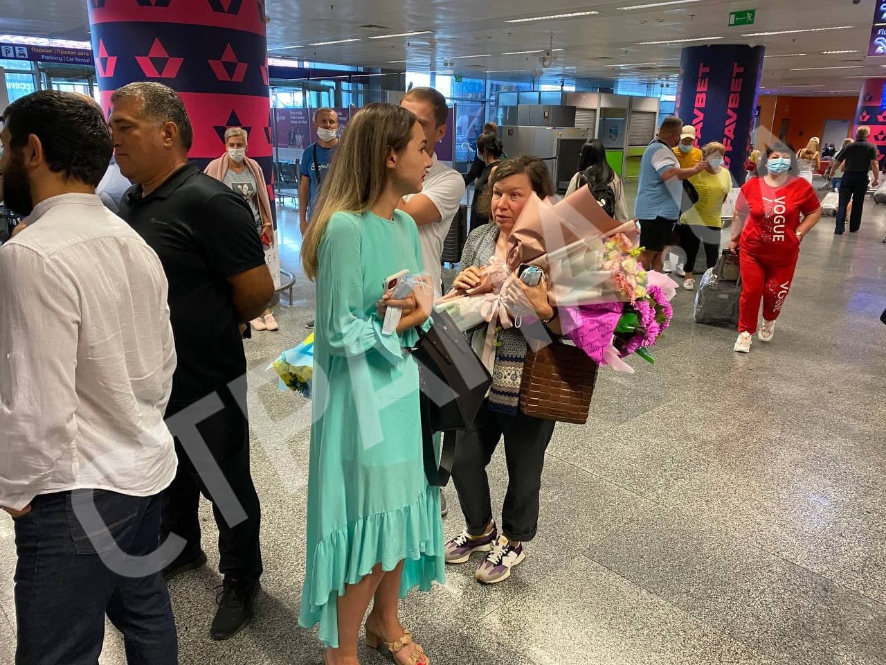 Встречать олимпийского чемпиона в аэропорт приехала мать Жана Беленюка, Светлана. Однако она буквально убегает от журналистов и отказывается от любых комментариев, закрываясь от камер букетами цветов.