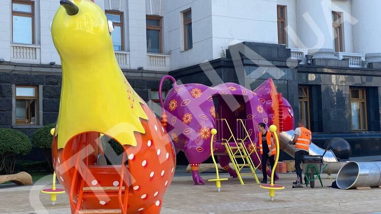 Под стенами Офиса президента появилась площадка с петухом в косоворотке. Ее откроют к Дню Независимости. Видео