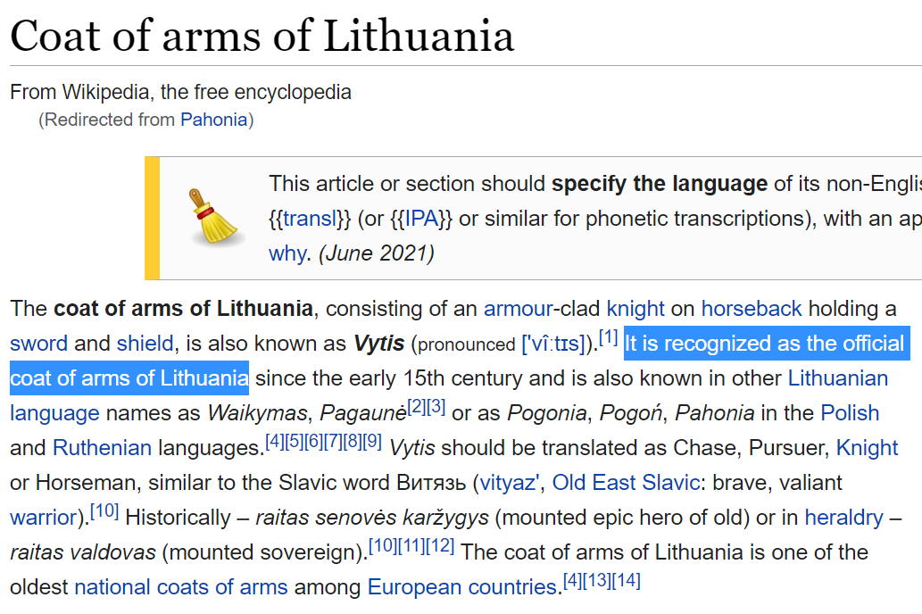 Если зайти на англоязычную версию Википедии, этот герб там теперь позиционируется исключительно как герб Литвы.
