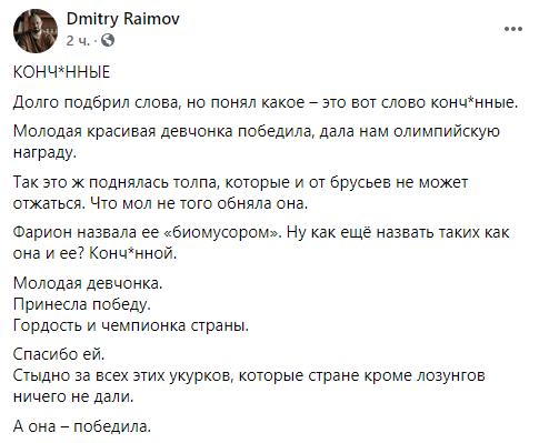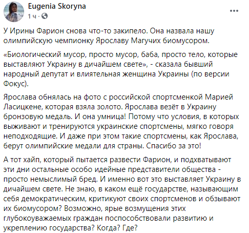 В наиболее грубой форме выступила украинизаторша и экс-нардеп от "Свободы" Ирина Фарион. Она назвала Ярославу "биомусором" и предложила НОК Украины отобрать у нее медаль.