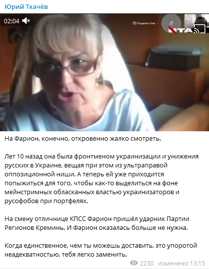 "Лет 10 назад она была фронтменом украинизации и унижения русских в Украине, вещая при этом из ультраправой оппозиционной ниши. А теперь ей уже приходится попыжиться для того, чтобы как-то выделиться на фоне мейнстримных обласканных властью украинизаторов и русофобов при портфелях.