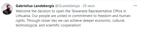 20 июля глава МИД Литвы Габриелюс Ландсбергис в своем Twitter-аккаунте заявил, что в стране откроют представительство Тайваня.