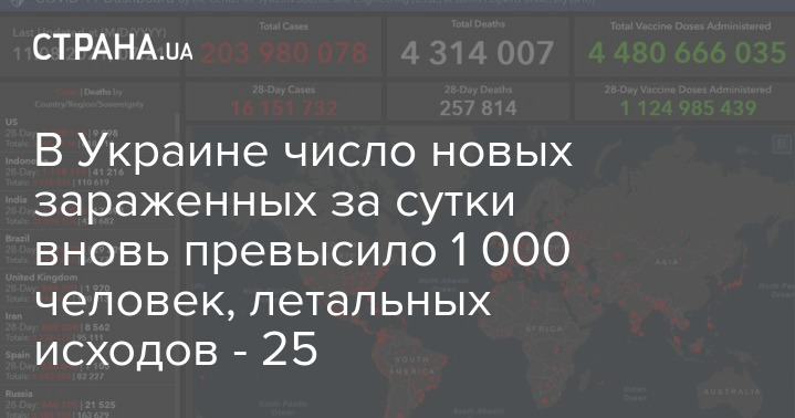 В Украине число новых зараженных за сутки вновь превысило 1 000 человек, летальных исходов - 25