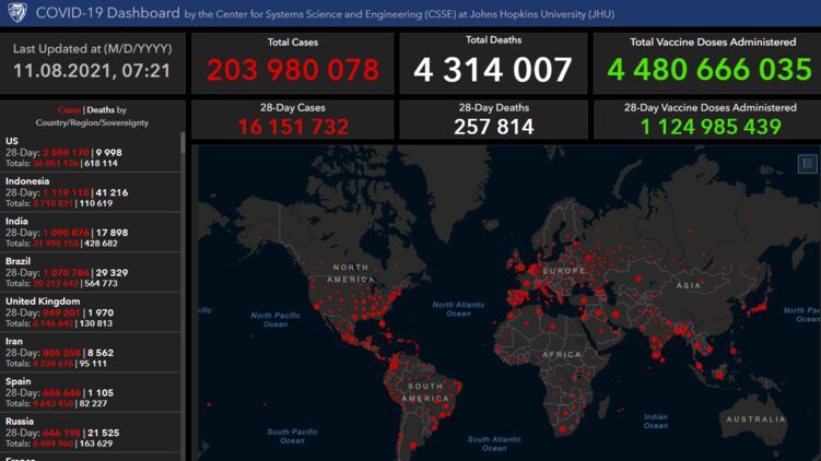 А тем временем университет Джона Хопкинса, который мониторит ситуацию с пандемией в режиме он-лайн привел свежие данные на утро 11 августа 2021 года. Итак, с момента начала пандемии на Земле коронавирусом заразились уже 203 980 078 человек, умерли - 4 314 007 человек.