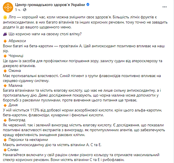 Представители Минздрава рассказали украинцам, какие из летних фруктов являются антиоксидантами и что следует добавить в свой рацион.