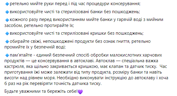 • помните - единственный безопасный способ обработки малокислотных пищевых продуктов - это консервирование в автоклаве.