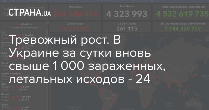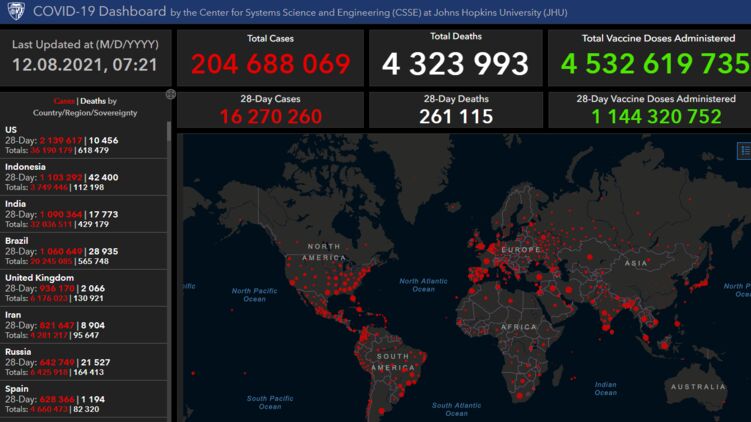 По данным на 12 августа, число зараженных на Земле приближается к 205 миллионам, фото: arcgis.com