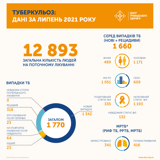 Так, в июле текущего года в Украине зафиксировали 1770 случаев туберкулеза. Среди них: