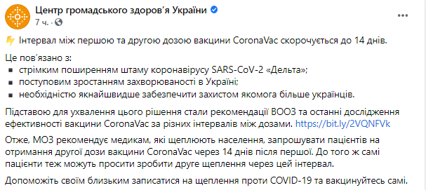 В МОЗ объяснили, почему интервал между прививками CoronaVac в Украине сократили до 14 дней