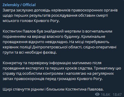По его словам, завтра он заслушает доклады правоохранителей по первым результатам расследования обстоятельств смерти Павлова. При этом Зеленский добавил, что будет держать расследование под личным контролем, а также будет настаивать на регулярных отчетах правоохранителей.