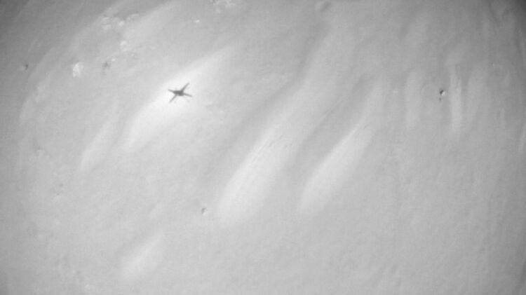 Черно-белый снимок Марса, который сделал вертолет, хорошо видна его тень. Фото: twitter.com/NASAJPL