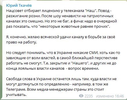 Свобода слова в Украине останется лишь там, куда власти не могут дотянуться по определению - например, в том же Телеграме. Всем медиа-менеджерам страны это стоит учитывать" - написал журналист Юрий Ткачев.