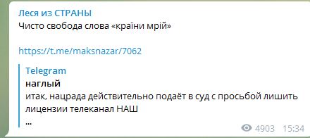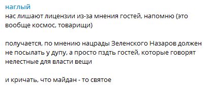 "Нас лишают лицензии из-за мнения гостей, напомню (это вообще космос, товарищи). Получается, по мнению Нацрады Зеленского Назаров должен не посылать у дупу, а просто п@ть гостей, которые говорят нелестные для власти вещи. И кричать, что майдан - то святое", - написал он.