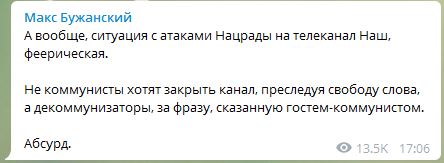 "А вообще, ситуация с атаками Нацрады на телеканал Наш, феерическая. Не коммунисты хотят закрыть канал, преследуя свободу слова, а декоммунизаторы, за фразу, сказанную гостем-коммунистом. Абсурд" - написал нардеп от "Слуги народа" Максим Бужанский.