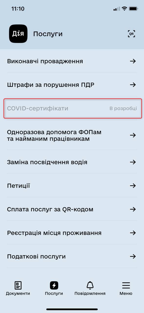 Далее выбираем "COVID-сертификат ("COVID-сертифікат" укр).