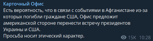 "Есть вероятность, что в связи с событиями в Афганистане из-за которых погибли граждане США, Офис предложит американской стороне перенести встречу президентов Украины и США.
