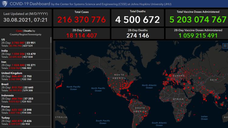 По данным университета Джона Хопкинса на 08:00 утра понедельника в мире коронавирус выявили у 216 370 766 человек. Умерло с начала пандемии 4 500 672 миллиона заболевших.