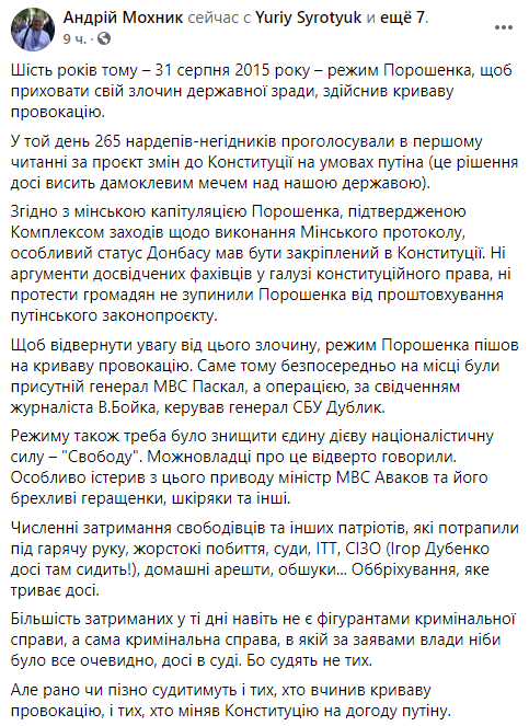 Шестую годовщину теракта прокомментировал в Facebook один из высокопоставленных членов ВО "Свобода" Андрей Мохнык. По его словам, бросок гранаты под Радой - это была провокация центральных властей и лично Порошенко.
