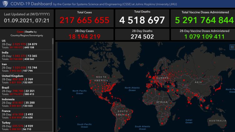 По данным университета Джона Хопкинса на 08:00 утра 1 сентября в мире коронавирус выявили уже у 217 665 655 человек. Умерло с начала пандемии 4 518 697 заболевших.