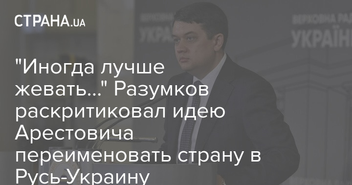Спикер парламента Дмитрий Разумков не поддерживает идею советника главы Офиса Зеленского Алексея Арестовича о переименовании Украины в Русь-Украину.