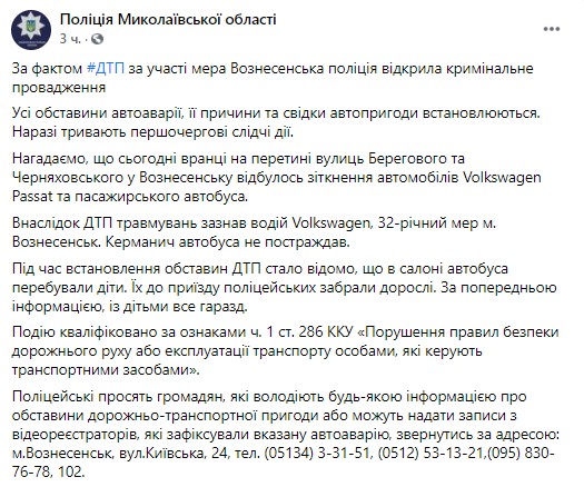 По факту дорожно-транспортного происшествия с участием мэра Вознесенска Евгения Величко полиция открыла уголовное производство. Авария произошла во вторник, 7 сентября, утром на пересечении улиц Берегового и Черняховского в Вознесенске. Автомобиль градоначальника, Volkswagen Passat, столкнулся с пассажирским автобусом. При столкновении транспортных средств пострадал сам 32-летний мэр. Об этом сообщает Нацполиция Николаевской области.