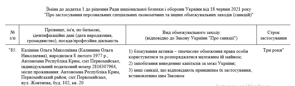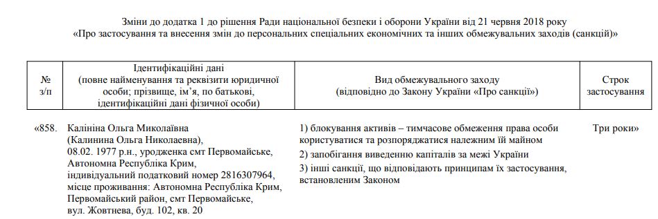 Выяснилось, что в приложении к Указу президента от 24 июня 2021 года, который продлевал санкции, вновь была указана крымская Ольга Калинина, но с персональными данными киевской.